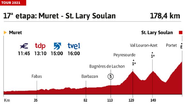 Etapa 17 Tour de Francia 2021. La etapa 16 del Tour de Francia 2021 se podrá ver por ESPN 2 canal disponible en todos los cableoperadores del país en sus señales básica y HD desde las 700 am. Peyresourde y Val Louron-Azet ambos de primera categoría y para terminar los 16 km de ascensión con un desnivel medio del 9 al Col du Portet de categoría Especial. Tadej Pogacar líder de la competencia.