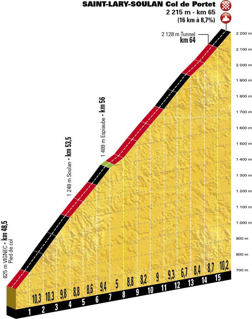 Peyresourde Val Louron-Azet and to finish off the 16-km climb at an average gradient close to 9 of the unforgiving Col du Portet.